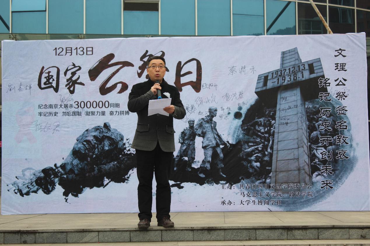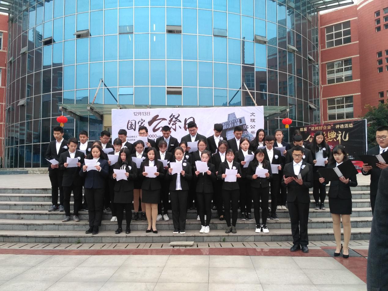 12月13号上午10点,由校团委与公司联合主办、博闻学社承办的以“铭记历史,珍爱和平;警惕右翼,复兴中华”为主题的南京大屠杀80周年公祭仪式在音乐广场隆重举行。仪式由公司党总支副书记张善喜主持,党总支书记刘春辉、青年教师代表张岚、学院150余名员工代表,老员工博闻学社等社团50名社团代表参加公祭仪式。