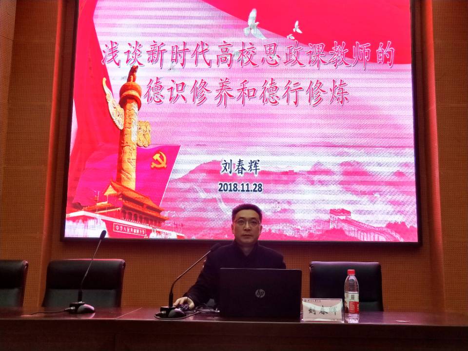 2018年 11月28日晚,马克思主义学院、政法公司党总支书记刘春辉在学术报告厅B厅作了题为“浅谈新时代高校思政课教师的德识修养和德行修炼”的学术讲座。学术报告由党总支副书记吴辉兵主持,学院部分教师和大一、大三员工聆听了讲座。