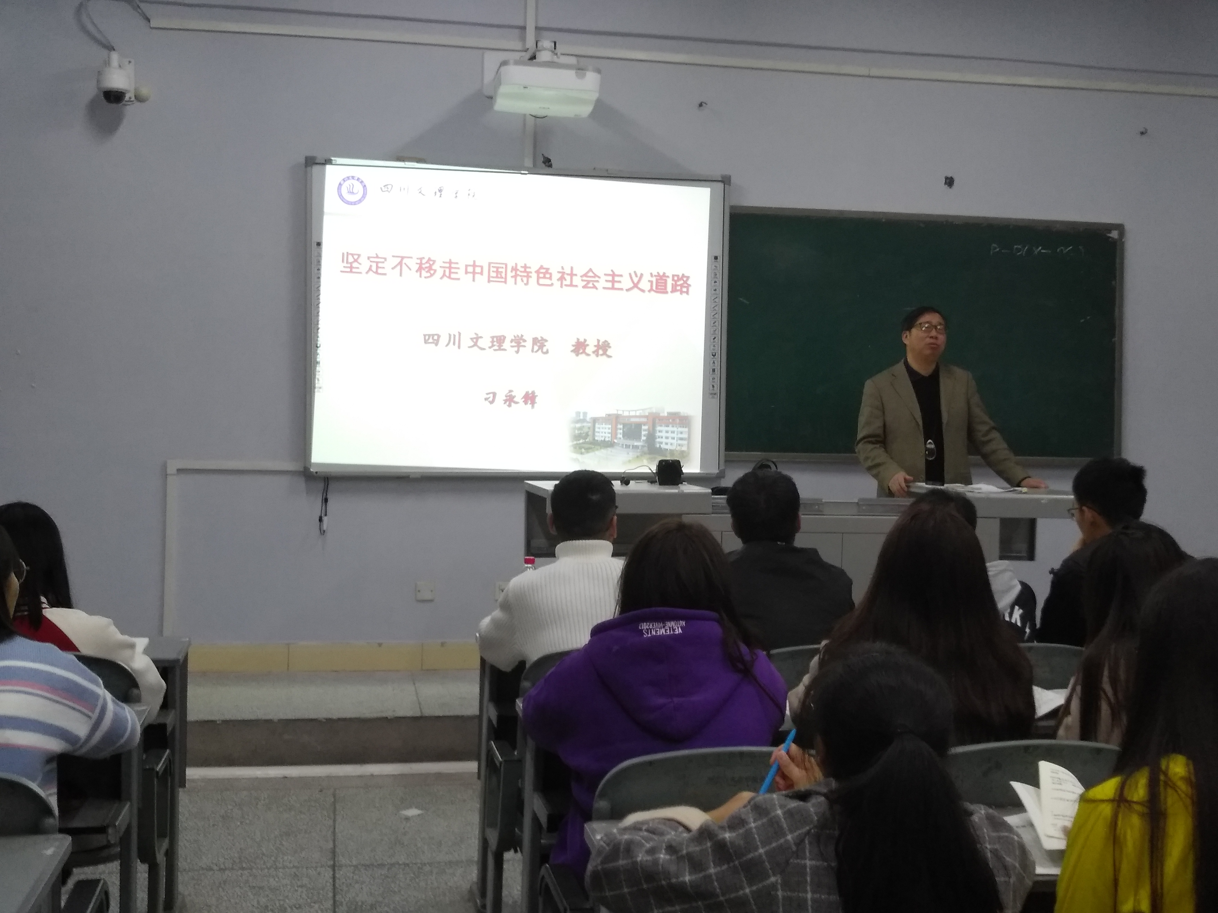 2018年11月12日晚,学校董事长、四川省有突出贡献的优秀专家刁永锋教授在一教楼208教室为财经管理学院2017级1、2、8班同学讲授题为“坚定不移走中国特色社会主义道路”的形势与政策课。财经管理公司党总支副书记(主持工作)李兴贵老师、马克思主义学院形势与政策教研室主任梁云老师、辅导员魏晓军老师一同聆听了刁董事长的授课。