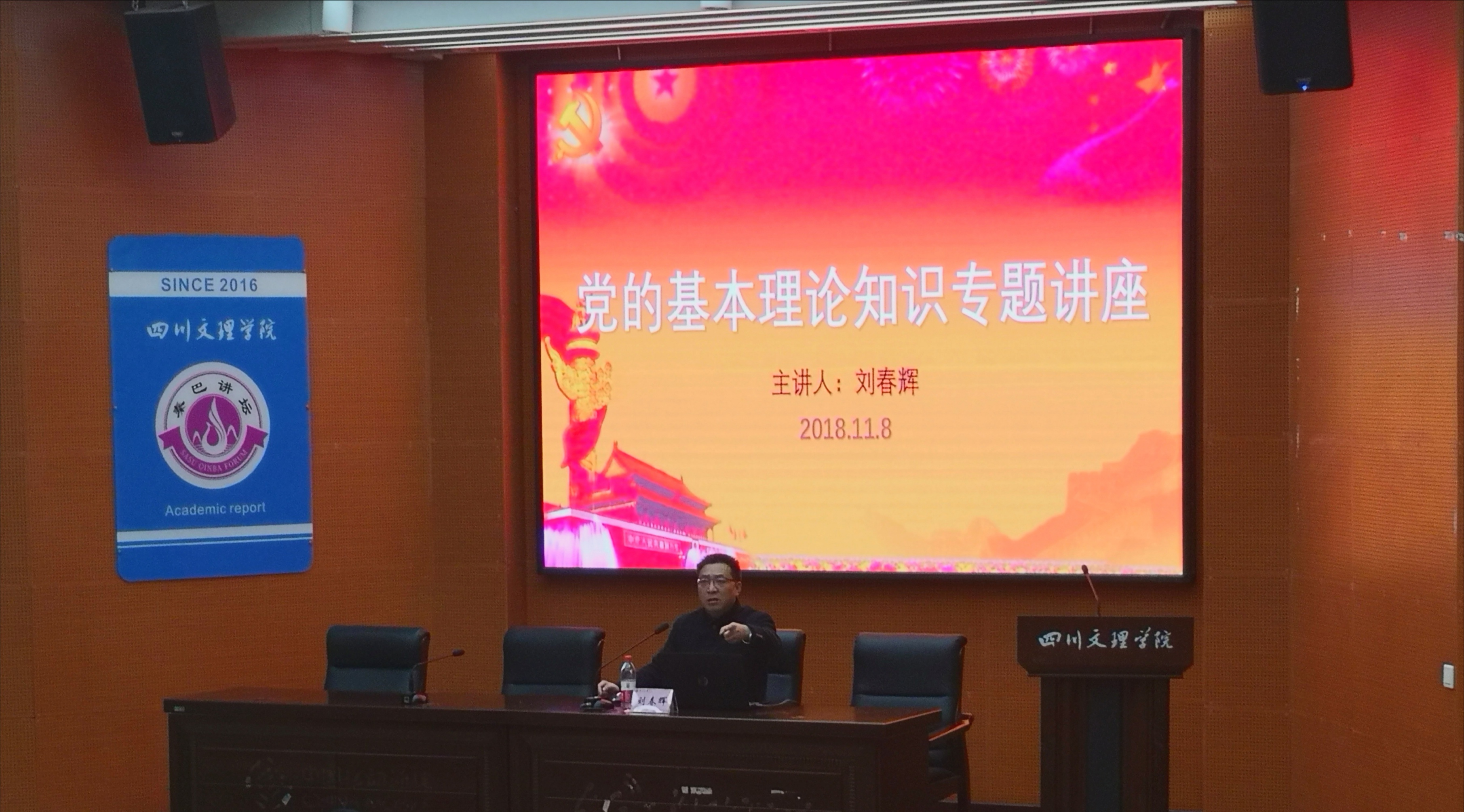 11月8日晚6:30,马克思主义学院、政法公司党总支书记刘春辉老师在莲湖校区学术报告厅B厅为学院大一员工作题为党的基本理论知识专题讲座。党总支副书记吴辉兵、学工办主任唐幸福、辅导员刘丹老师出席讲座。2018级全体员工到场聆听。讲座由党总支副书记吴辉兵主持。