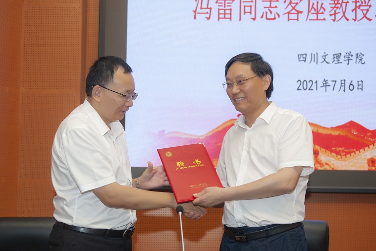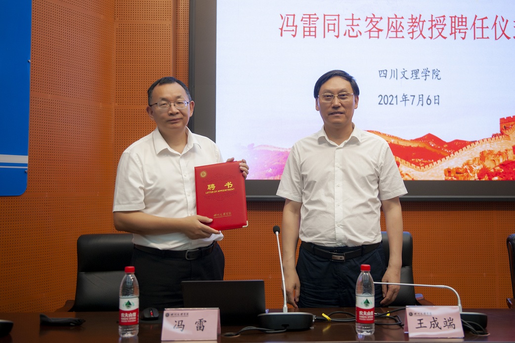 王成端向冯雷颁发客座教授聘书,希望冯雷为学校的知识产权人才培养、教育培训、课题研究、团队建设、教学研究、学术研讨、团队培养、教材建设和国际交流合作等方面贡献智慧和力量。同时,要求知识产权学院、四川省知识产权培训(bevictor伟德官网)基地抓住机遇,多请冯雷给师生上课,充分发挥其社会影响力,积极组织申报有关知识产权方面的各级各类项目,促进学校和学院、基地各项工作迈上新台阶。
