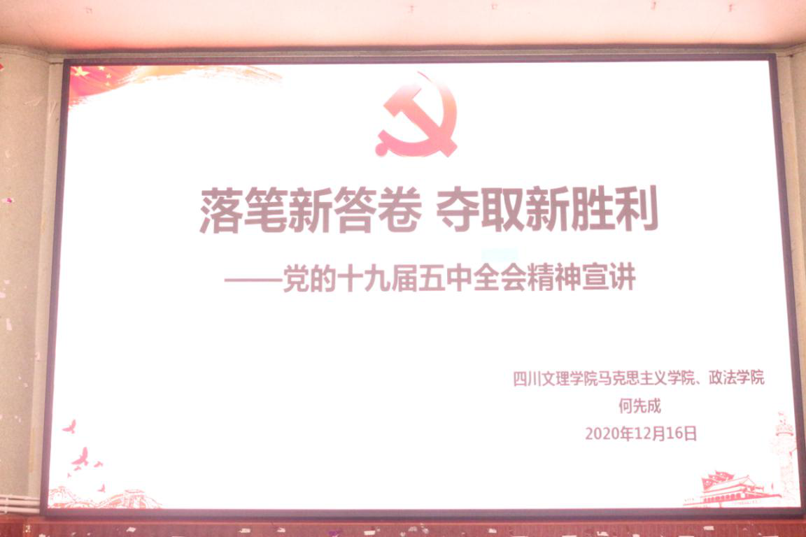 为引导新时代老员工更好地学习了解党的十九届五中全会精神,12月16日上午10:00,副经理何先成博士在南坝校区学术报告厅以“落笔新答卷,夺取新胜利”为主题为外国语学院2020级全体员工进行党的十九届五中全会精神宣讲。外国语学院2020级辅导员刘欣蕾老师主持宣讲会。