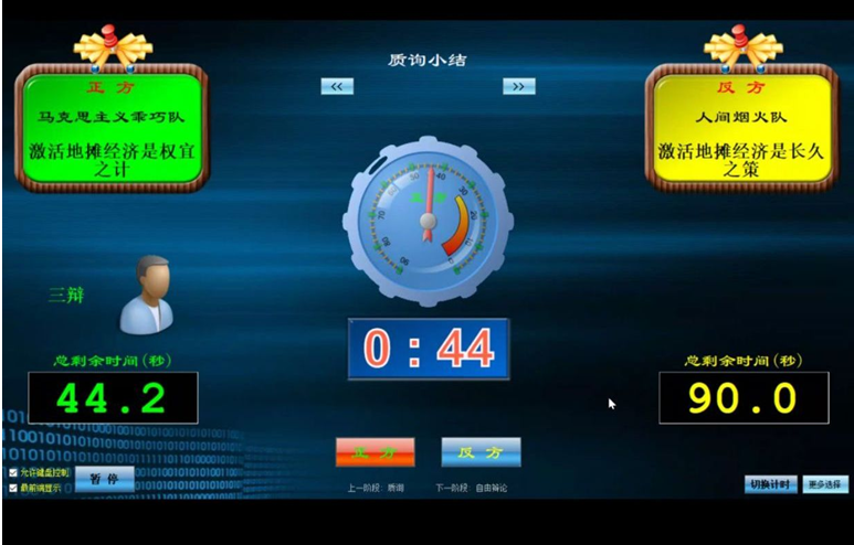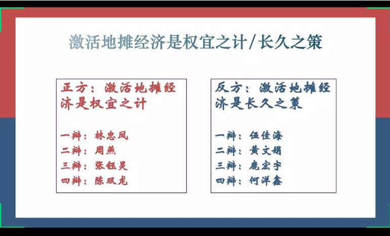 首先在正反两方自我介绍后,比赛进入开篇立论环节。正方以“激活地摊经济是权宜之计”为辩题,反方以“激活地摊经济是长久之策”为辩题,双方展开了精彩绝伦的辩论。在攻辩环节,正方与反方选手个个思路清晰,从多方面切入,字字珠玑,线上的气氛迅速升温。