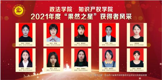 近日,公司根据《学院“果然之星”奖学金评定办法》,经过学院评定,知识产权专业李茂林等10名同学们获得学院2021年度“果然之星”荣誉称号。