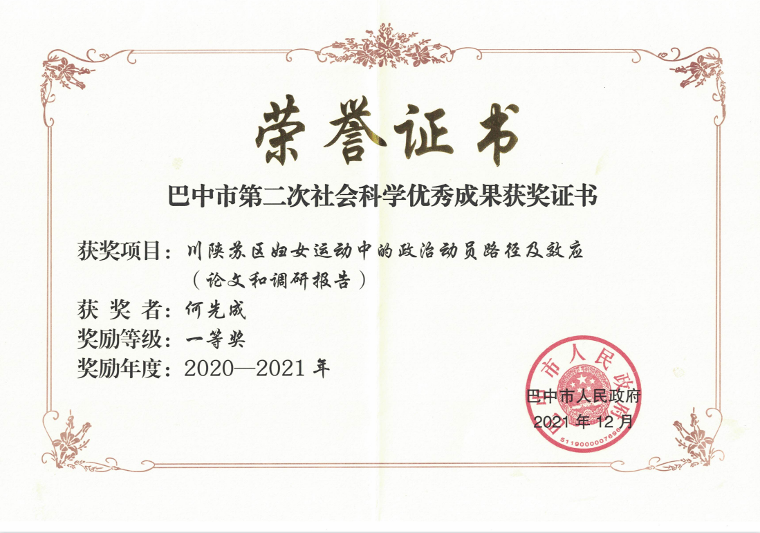 近日,根据巴中市人民政府办公室印发的《巴中市人民政府办公室关于表扬巴中市第二次社会科学优秀成果的通报》(巴府办发〔2021〕19号)文件通知,巴中市人民政府对评选出的62项优秀成果进行表彰。副经理何先成的科研成果《川陕苏区妇女运动中的政治动员路径及效应》荣获一等奖。