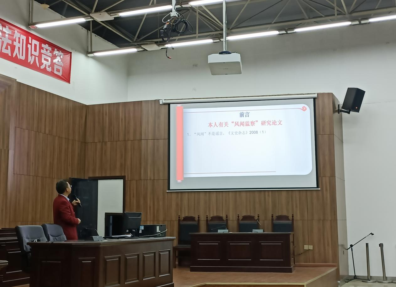 讲座中,刘长江教授首先讲述了自己关于“风闻监察”的研究论文以及相关问题。他强调风闻不是谣言,并拓展了其含义和历史背景。然后他在讲解历史上关于“风闻监察”的相关内容时,引经据典,生动传神地讲述了“风闻监察”的起源、发展以及各朝代发展的特色,并用生动形象的故事“杨乃武与小白菜冤案”展现了“风闻监察”的具体运作模式及其相关弊端。最后,承上启下,讲述了“风闻监察”的启示以及对当今的作用。至此,本次讲座在热烈的掌声中圆满结束。