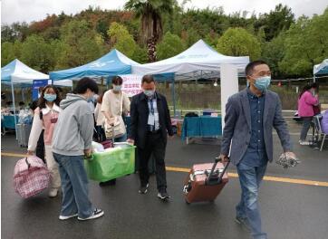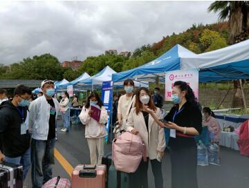 接待现场,由公司党政领导、任课教师、辅导员老师和员工志愿者组成的志愿服务队在迎新接待现场开展简洁快速的“一站式”志愿服务。南客站志愿服务师生在车站查验新生健康码、行程卡、24小时核酸检测阴性证明报告,引导员工乘坐接待车辆到学校报到。校园内志愿者引导员工验证身份、扫码报到,为同学们发放校园卡、安排寝室,办理入住手续、帮助他们运送行李等。