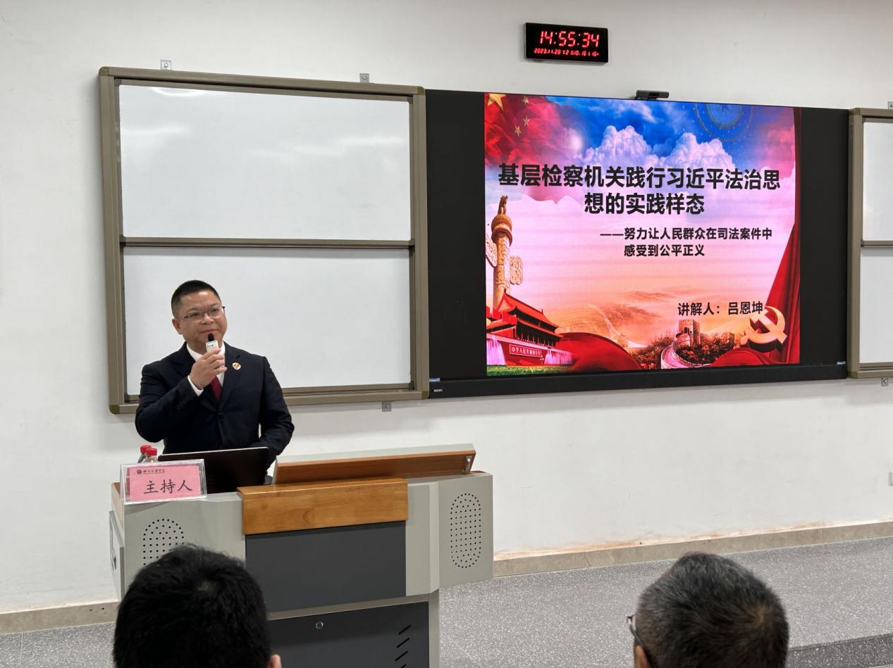 吕恩坤检察长从司法案件中的公平正义、努力实现公平正义、坚持“以人民为中心”的司法、让人民群众感受到公平正义四个层面深入浅出的讲述了新时代司法中践行习近平法治思想,努力让人民群众在司法案件中感受到公平正义的基本要点和具体要求。吕恩坤检察长将理论知识与典型案例相结合,以案例解释法治理论,以案例阐明司法实践,指明了新时代法科老员工理论学习与职业实践的要点、思路与方法。