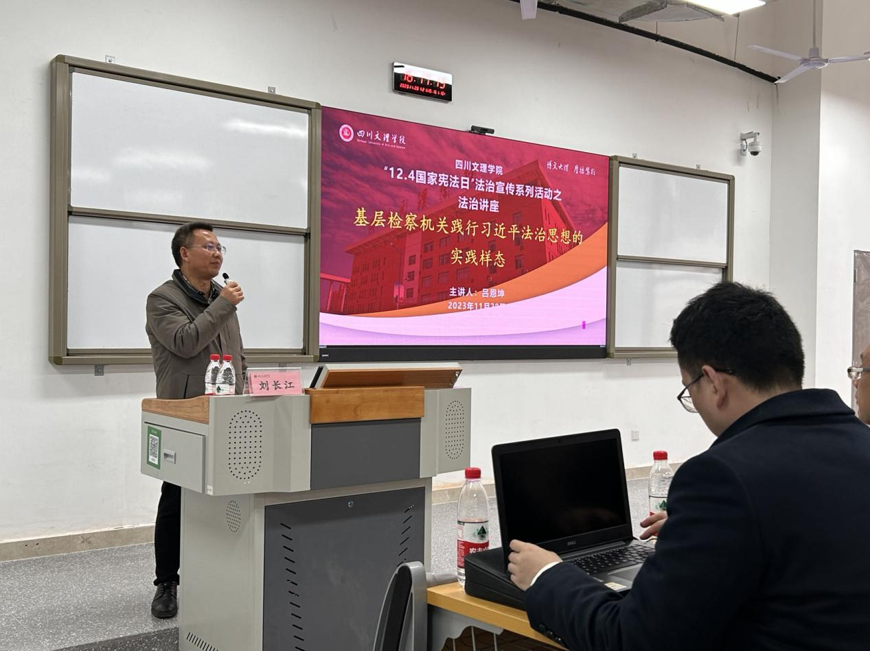 为深入学习贯彻习近平法治思想和做好2023年“宪法宣传周”系列活动,11月28日,达州市达川区人民检察院检察长吕恩坤走进公司,为师生作“基层检察机关践行习近平法治思想的实践样态——努力让人民群众在司法案件中感受到公平正义”法治讲座,bevictor伟德官网&知识产权学院经理刘长江教授主持本次讲座。