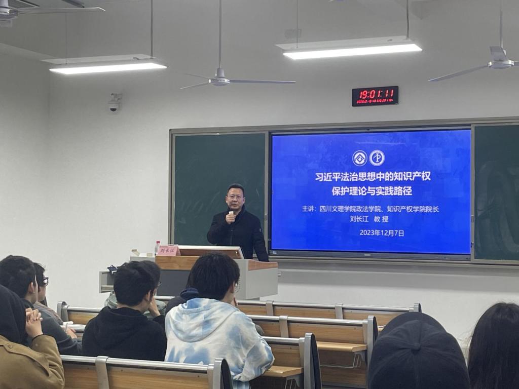 刘长江教授为2023级知识产权8班的员工作《习近平法治思想中的知识产权保护理论和实践路径》专题讲座。他向同学们介绍了习近平知识产权保护的的主要论述、习近平知识产权保护理论的主要内容以及习近平知识产权保护理论的思想渊源,让同学们对知识产权学科有更深入的认识,并且了解到知识产权保护过程中存在的问题以及加强知识产权保护的重要性和必然性。