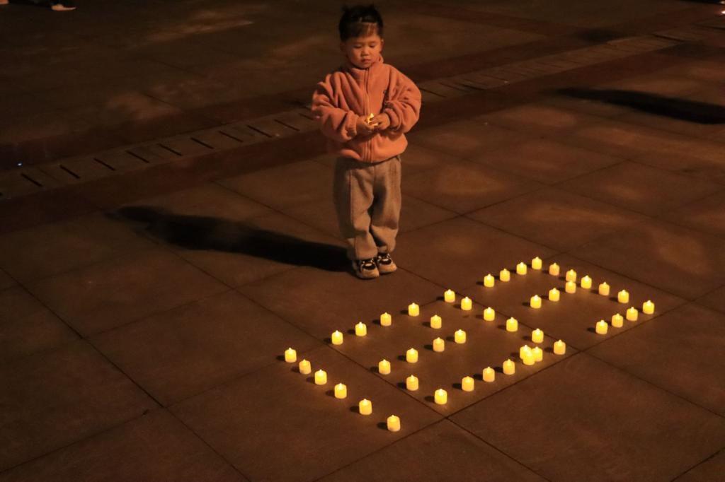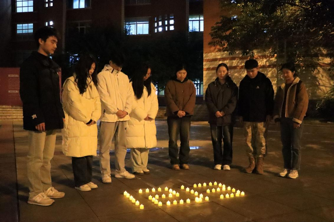13日晚上8时,在音演广场的南京大屠杀公祭日主题活动展板前摆放了呈“12.13”“南京!”等字样的电子蜡烛,学校的员工自愿前来参与,在电子蜡烛帮拍照留念,驻足默哀。也有员工有感而发演唱爱国歌曲、发表演讲等等。