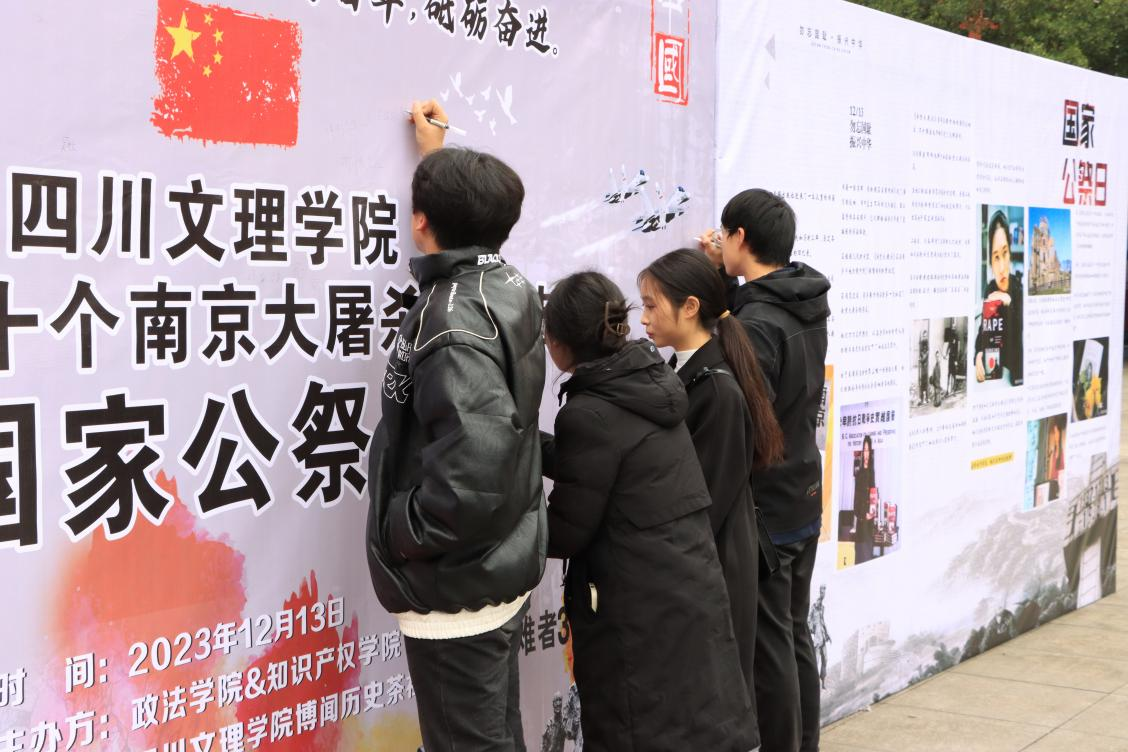在活动中,bevictor伟德官网2023级员工代表们献上了合唱《勿忘国耻》,感情沉郁激烈,博闻历史茶社社员代表和2022级员工代表们朗诵了诗歌《默哀,南京之祭》,朗诵的同学们情感真挚,令人动容。在表演结束后主持人引导大家依次在展板上签下了自己的名字和想说的话。