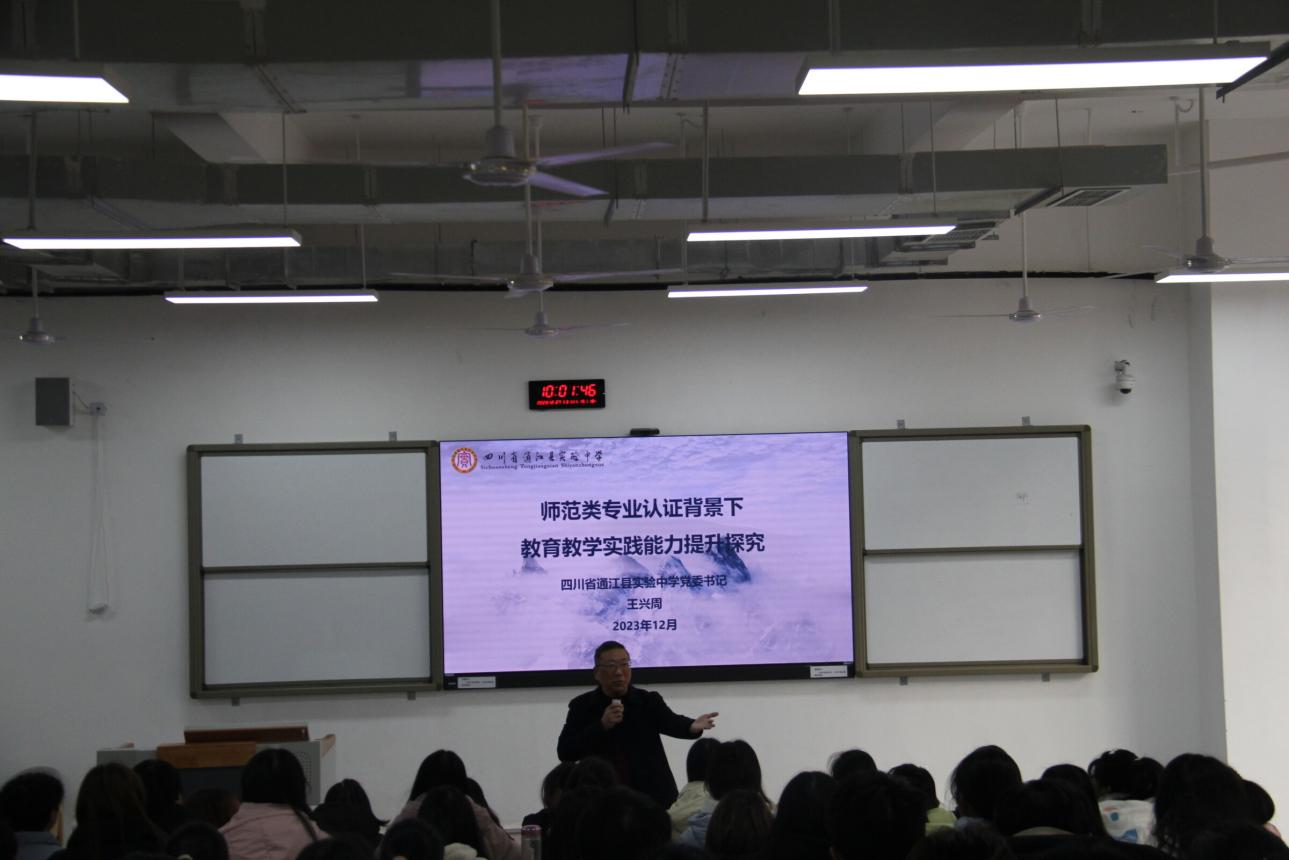 12月27日上午,四川省通江县实验中学党委书记王兴周在东A318进行“师范认证生公司产品能力提升研究”专题讲座,经理刘长江教授主持,公司2021级1班、2023级1班和3班全体员工到场聆听。