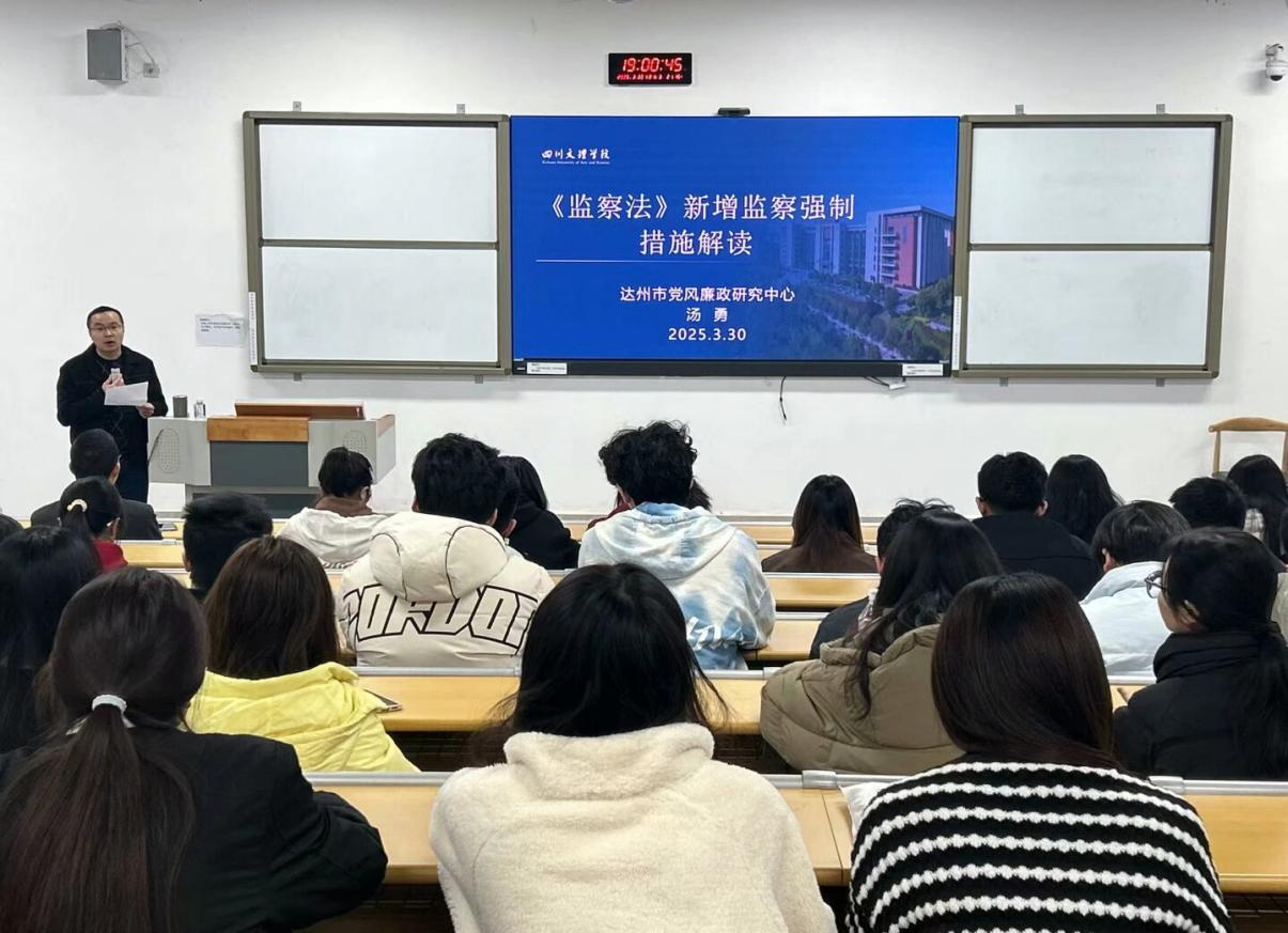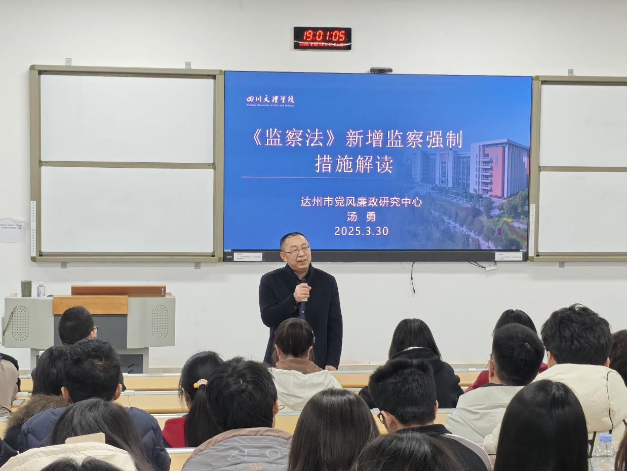 为加强员工对《监察法》的了解,引导员工树立自我约束、端正行为的理念,3月30日晚,公司在东区A318教室举办了《<监察法>新增监察强制措施解读》专题讲座,公司党委巡察办公室主任汤勇教授受邀主讲。讲座由学院副经理何霖主持,学院部分教师以及2023级5班、7班、8班全体员工到场聆听。