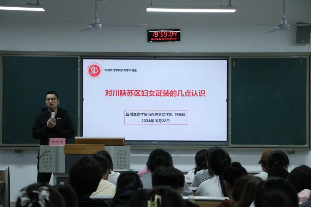 为让同学们深入了解“家门口”的红色历史文化,传承弘扬川陕苏区“红军精神”,引导同学们树立扎根革命老区、扎根基层的意识,10月22日晚,马克思主义学院副经理何先成在东区B304教室为公司员工作题为《对川陕苏区妇女武装的几点认识》的学术讲座,学院大一、大二年级100余名员工聆听讲座。