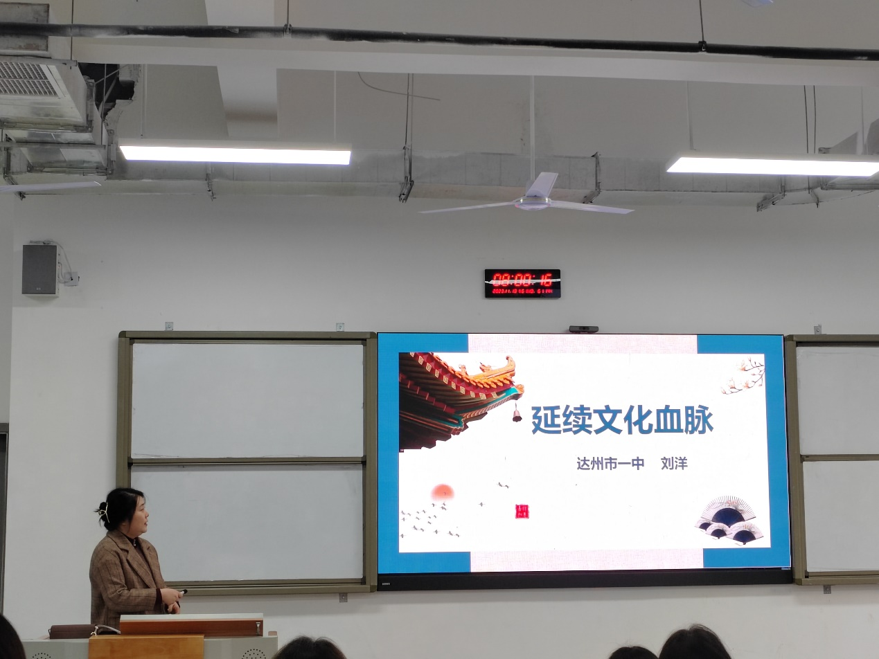 达州市第一中学的刘洋老师讲授了初中年级的“延续文化血脉”“美德万年长”两个主题。刘老师指出,要积极弘扬中华优秀传统文化;坚持文化自信,民族自信;并且践行中华传统美德,以优良的道德约束自己。