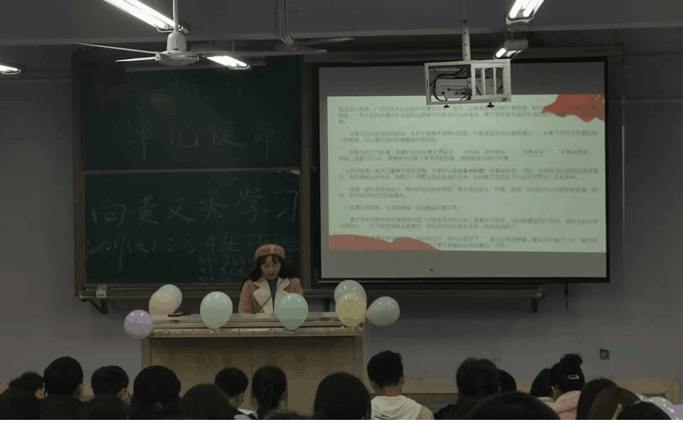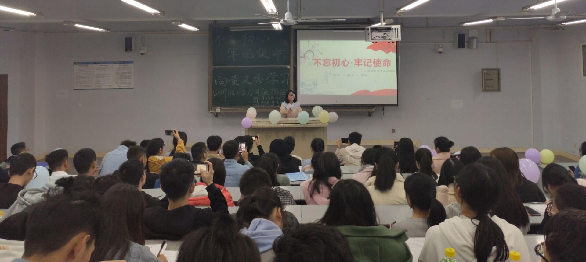 各班通过观看视频或文字资料学习了黄文秀同志的先进事迹。黄文秀同志北京师范大学研究生毕业后,放弃大城市的工作机会,回到自己的家乡广西百色市乐业县工作,在脱贫攻坚第一线倾情投入、奉献自我。2019年6月17日,黄文秀同志在突发山洪中不幸遇难,献出了年仅30岁的宝贵生命,失去了夏花般璀璨的生命。她用美好青春诠释了共产党人的初心使命,谱写了新时代的青春之歌。
