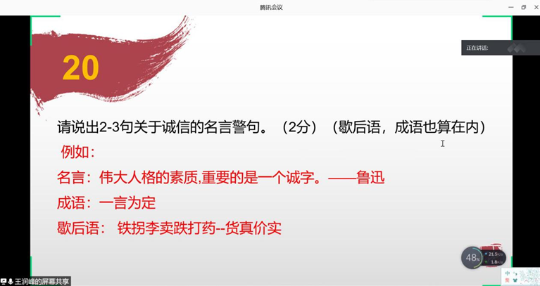 6月27日19:00时,为传承和弘扬中华民族诚实守信的传统美德,提高同学们的诚信素养,积极践行社会主义核心价值观,公司在腾讯会议上成功开展了诚信知识竞赛。此次竞赛邀请了学院团总支副书记彭森林、团总支常务第二副书记、员工会主席汪洁、团总支第三副书记李梅、员工会副主席杨淇童担任竞赛评委并参与小组分数统计。2018级、2019级共22支队伍参加竞赛。