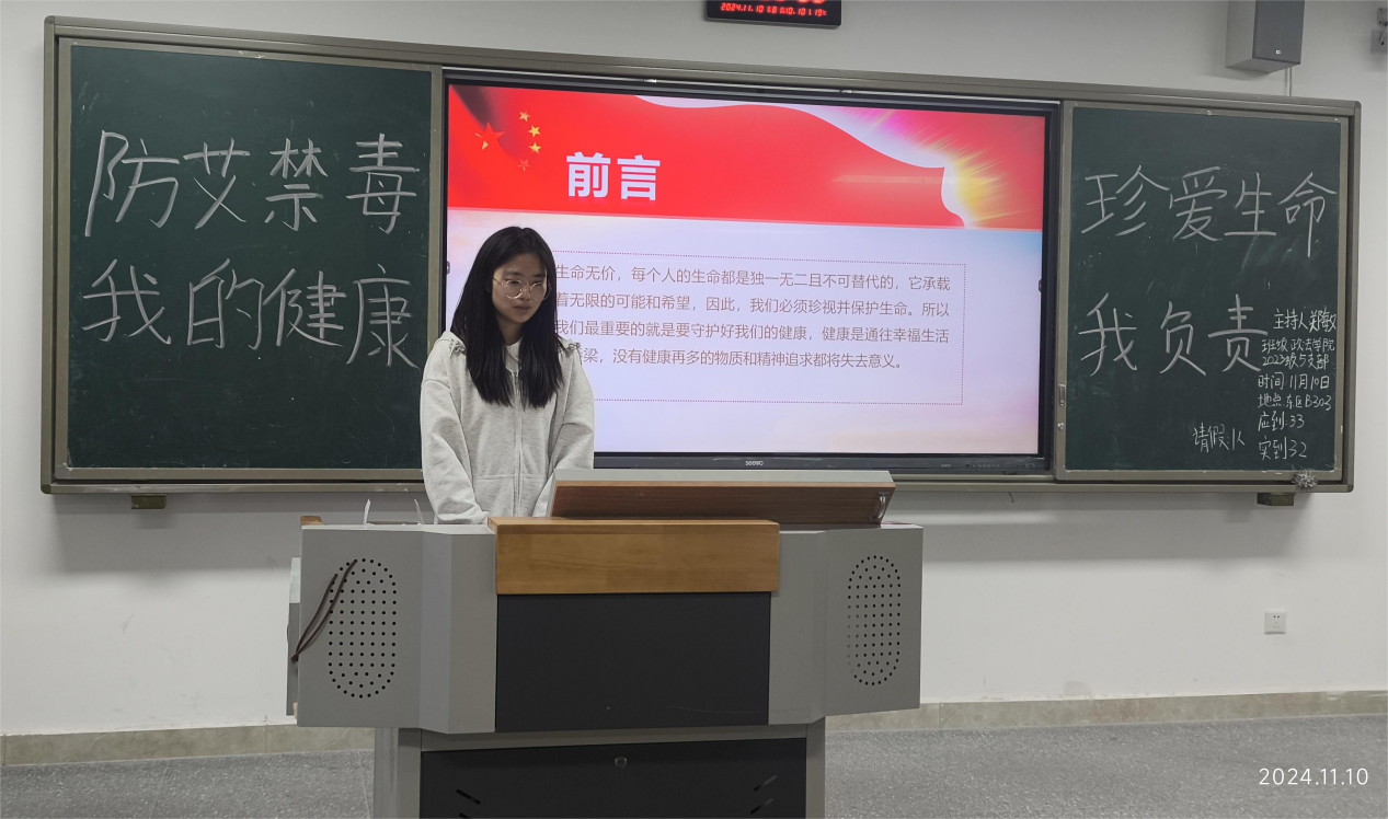 为深入学习贯彻习近平新时代中国特色社会主义思想,进一步加强校园防艾禁毒宣传教育工作力度,不断深化团员青年防艾禁毒教育工作,提高他们防艾禁毒的意识和能力,切实筑好“校园安全防护墙”,2024年11月10日晚上,公司各团支部在莲湖东区教学楼开展“防艾禁毒,珍爱生命——我的健康,我负责”主题团会。各班团支书主持,带班辅导员出席并讲话,全体同学参加。