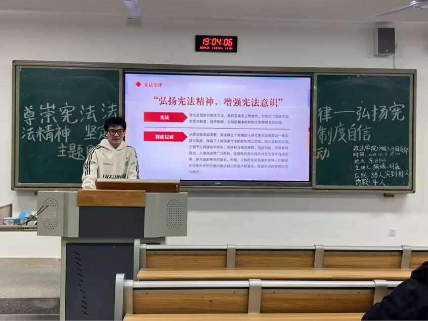 各团支部通过宣讲、领学、诵读或集中观看视频资料等方式,深入浅出地阐述了宪法的历史沿革、核心内容以及在国家法治体系中的根本地位,并结合诸多生动鲜活且具有广泛社会影响力的实际案例,将宪法条文与现实生活紧密相连,让同学们真切感受到宪法与自身息息相关,深刻体会到宪法在保障公民权利、维护社会秩序等方面的根本作用,从而增强制度自信。