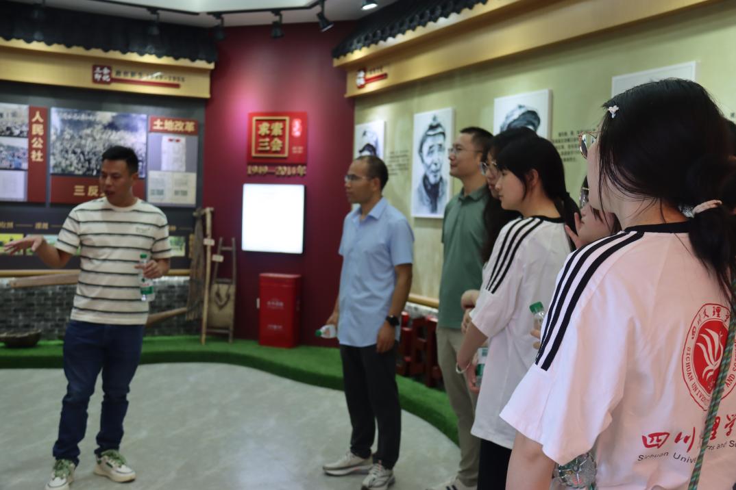 上午9时,团队一行乘车抵达苍溪县五龙镇,受到五龙镇工作人员的热情接待。在副镇长陈学军全程陪同与引导下,团队开启沉浸式红色教育之旅。活动第一站是三会村,在村干部仲良成带领下,团队一行走进苍溪县党史教育三会研学基地。在展馆内部,通过聆听村干部讲解,团队一行详细了解了三会村的红色历史,以及三会村在党和国家大力支持下脱贫摘帽和走向乡村振兴的奋斗历程,深刻理解了革命精神如何转化为基层建设动力,直观领悟了农村发展与时代进步的紧密关联。随后,三会村老党员沈治忠结合6幅浮雕,深情讲述汉藏情缘故事,重现党群同心、军民一心和民族团结的动人场景,让同学们深切体会到革命胜利的艰辛与当下幸福生活的珍贵。