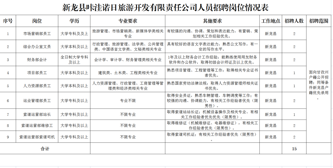 (一)拟面向甘孜州公开招聘工作人员15名,具体岗位及要求详见《新龙县咔洼诺日旅游开发有限责任公司2023年人员招聘岗位情况表》(附件2)。