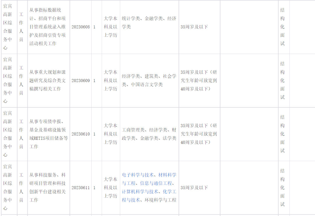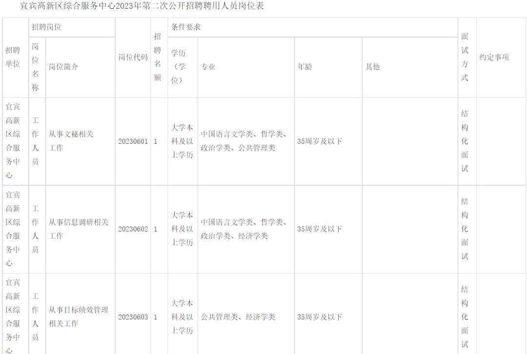 招聘聘用人员37名,岗位具体情况详见本公告附件1《宜宾高新区综合服务中心2023年公开招聘聘用人员岗位表》。